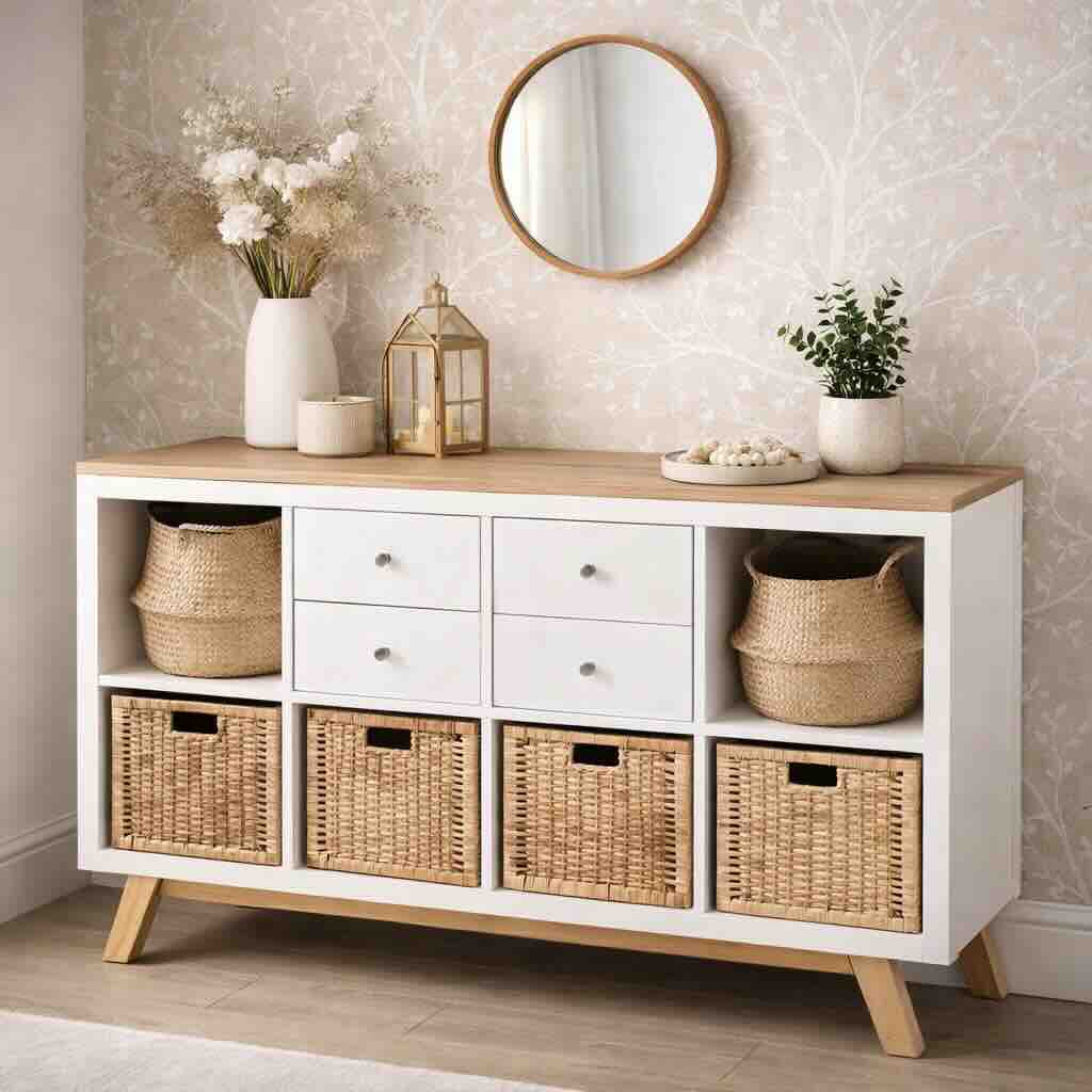 Adding ribbed panels and sleek gold handles to a classic white IKEA Kallax, this once-basic storage unit is elevated into a high-end, designer-style sideboard
